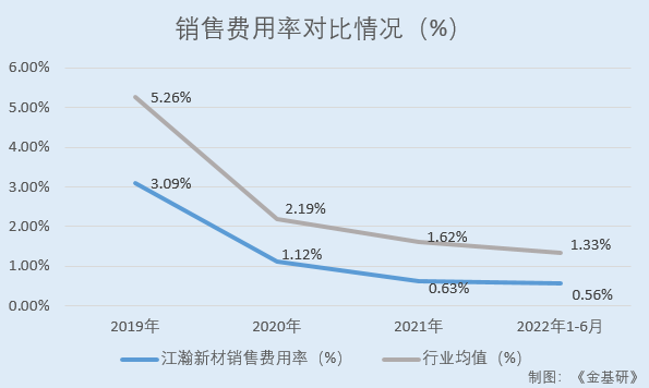 同期,江瀚新材同行業(yè)可比公司宏柏新材、晨光新材的銷(xiāo)售費(fèi)用率均值分別為5.26%、2.19%、1.62%、1.33%。