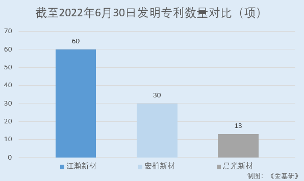 另?yè)?jù)半年報(bào)數(shù)據(jù),截至2022年6月30日,江瀚新材同行業(yè)可比公司宏柏新材共獲得授權(quán)發(fā)明專(zhuān)利30項(xiàng);晨光新材擁有發(fā)明專(zhuān)利13項(xiàng)。