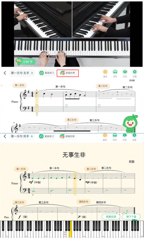 除了上面提到的幾個(gè)小技巧,小葉子鋼琴APP的練鋼琴功能也能幫助孩子更好打牢基本功。在課后的日常練習(xí)過(guò)程中,可以通過(guò)觀看相應(yīng)曲子的示范演奏視頻,糾正手型、指法等問(wèn)題。在“識(shí)譜”模式下練習(xí),彈對(duì)音符會(huì)直接變綠,如果彈錯(cuò)曲譜則會(huì)暫停大概5秒后,通過(guò)小鍵盤(pán)提示正確的琴鍵位置。以此幫助孩子更好識(shí)譜,輕松認(rèn)準(zhǔn)每一個(gè)音?!拔页銖棥惫δ芨峭昝肋€原了線下老師帶著學(xué)生唱譜的環(huán)節(jié),孩子可以一邊打拍子一邊跟著唱,從而熟悉旋律,幫助解決孩子節(jié)奏不準(zhǔn)、拍子不飽和、搶拍等實(shí)際演奏問(wèn)題。