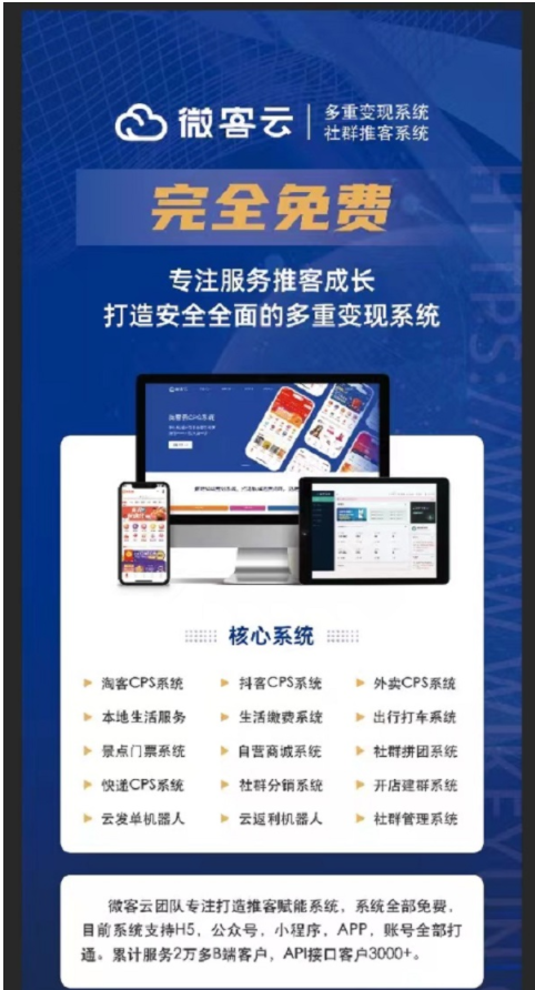 微客云自上線以來,總店鋪數量已達到10000+,授權發(fā)布上線的小程序等已有5000+,已獲得了大批客戶的好評,不管是做淘客CPS方向、還是生活服務方向,又或者是專注會員權益的,已有不少創(chuàng)業(yè)者通過微客云賺取了第一桶金,月收益能有5W+,數據都做的非常好看,同時每天會有大量的新創(chuàng)業(yè)者來使用微客云。我們也收到了大量的用戶需求,很多客戶都是想著現(xiàn)在經濟下行情況下,系統(tǒng)能不能免費,技術小哥加班加點,今天他來了: