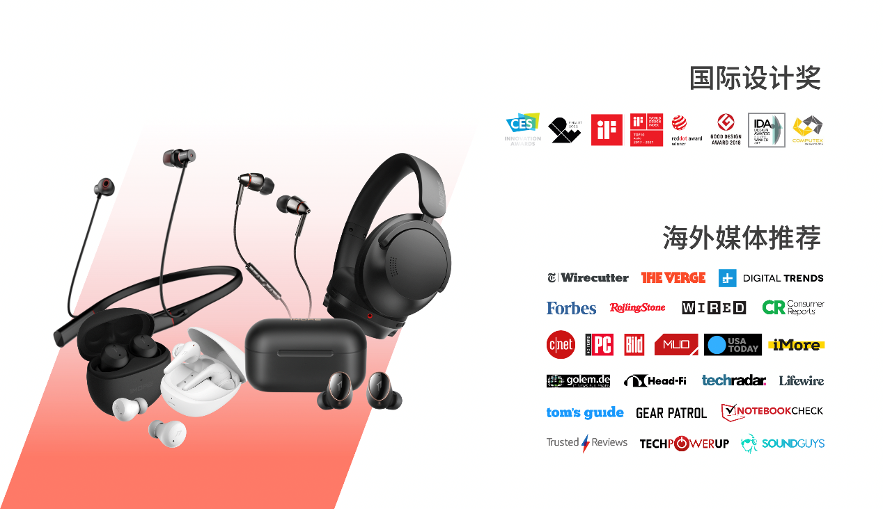 1MORE萬(wàn)魔耳機(jī)專注專業(yè)聲學(xué)與智能軟硬件的研發(fā),自2013年品牌成立以來(lái),累積的授權(quán)專利達(dá)330件,斬獲國(guó)際四大權(quán)威設(shè)計(jì)獎(jiǎng)共 40 項(xiàng)(包括德國(guó) iF 設(shè)計(jì)獎(jiǎng)、德國(guó)紅點(diǎn)設(shè)計(jì)獎(jiǎng)、美國(guó) IDEA 設(shè)計(jì)獎(jiǎng)、日本G-Mark優(yōu)良設(shè)計(jì)獎(jiǎng)),連續(xù) 4 年 12 款產(chǎn)品獲得美國(guó) CES 創(chuàng)新設(shè)計(jì)獎(jiǎng),多款產(chǎn)品獲得 EHA(歐洲硬件協(xié)會(huì))“年度最 佳耳機(jī)獎(jiǎng)”,美國(guó)知名權(quán)威媒體《消費(fèi)者報(bào)告》亦將其 2 款產(chǎn)品列為全球耳機(jī)類 186 個(gè)名牌競(jìng)品中的第 一名、第二名向消費(fèi)者重點(diǎn)推薦。眾多來(lái)自行業(yè)機(jī)構(gòu)、權(quán) 威雜志、評(píng)測(cè)網(wǎng)站和消費(fèi)者的認(rèn)可,既是對(duì)萬(wàn)魔耳機(jī)過往的肯定,也是萬(wàn)魔耳機(jī)不斷科技創(chuàng)新的動(dòng)力。