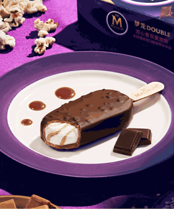 這次的夢龍全新日夜CP與此前推出的日夜CP不同的是,這次的夢龍雪糕里面包裹著濃郁的流心醬。屬于白天的夢龍DOUBLE生椰熱情果口味冰淇淋里面融合了熱情果芒果流心醬,口感酸酸甜甜,頗具特色;屬于黑夜的太妃爆米花口味冰淇淋則搭配了海鹽焦糖風味流心醬,口感咸甜,個性十足。