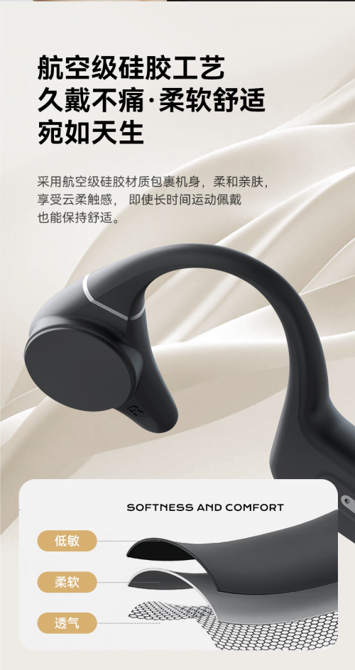 這款Runner Pro4S的設(shè)計是專為我們國人打造的最 佳選擇,它還采用了縱橫向15個不同張力分布點,從而實現(xiàn)了受力的均勻分散,重心更加穩(wěn)定,佩戴更加輕松舒適。另外在耳機(jī)的機(jī)身還采用了航空級硅膠材質(zhì),無縫隙一體,任意彎曲全密封設(shè)計,真正為我們帶來更加舒適、親膚的佩戴體驗。