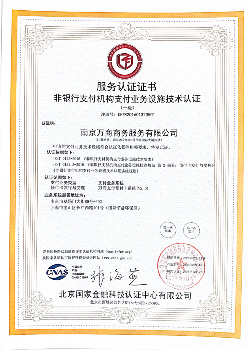 南京萬(wàn)商正式獲得北京國(guó)家金融科技認(rèn)證中心有限公司(原中金國(guó)盛認(rèn)證中心)頒發(fā)的“非銀行支付機(jī)構(gòu)支付業(yè)務(wù)設(shè)施技術(shù)認(rèn)證”證書(證書編號(hào):CFNR201601320501)。