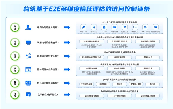 而零信任聚焦業(yè)務(wù)安全接入,從身份、終端、連接、權(quán)限、數(shù)據(jù)和行為等不同維度,幫助用戶安全訪問業(yè)務(wù),構(gòu)筑了基于端到端多維度信任評(píng)估的訪問控制鏈條。