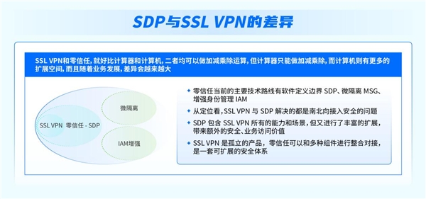 舉個(gè)例子來說,SSL VPN 和零信任,好比是計(jì)算器和計(jì)算機(jī),二者都做數(shù)據(jù)運(yùn)算,但計(jì)算器只能做加減乘除,而計(jì)算機(jī)有著更多的擴(kuò)展空間,不論是能力擴(kuò)展,還是場景擴(kuò)展,都會(huì)存在差異,且隨著后續(xù)的發(fā)展,差異也會(huì)越來越大。