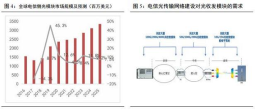 從光模塊下游市場來看,1 ) 電信市場是光模塊的發(fā)源場景,需求保持穩(wěn)中有增 。一方面 , 電信用光模塊主要集中在前傳 ,對光模塊速率要求低且產(chǎn)品迭 代速率慢,三大運營商計劃將資本開支逐漸傾斜于云計算等算力網(wǎng)絡場景; 另一方面 ,光纖入戶規(guī)模擴大與速率向 10G PON 升級助推光模塊需求; 2 ) 數(shù)通市場是光模塊主要市場且發(fā)展迅速 。數(shù)據(jù)中心流量增加和網(wǎng)絡架構(gòu)由傳統(tǒng)架構(gòu)轉(zhuǎn)變?yōu)槿~脊網(wǎng)絡架構(gòu)推動光模塊數(shù)量和速率快速提高。目前光模塊正處于向 800G 速率發(fā)展的新周期。