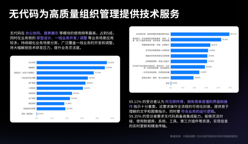 此外,中國信通院云大所政企數(shù)字化轉(zhuǎn)型部業(yè)務(wù)主管鄭詩昊,也從無代碼賦能企業(yè)數(shù)字化洞察的角度指出:無代碼在辦公協(xié)同、報表展示等模塊的使用頻率高,同時在業(yè)務(wù)側(cè)的原型設(shè)計、一線業(yè)務(wù)開發(fā)/調(diào)整等業(yè)務(wù)場景應(yīng)用也較多;且廣泛覆蓋一線業(yè)務(wù)的開發(fā)和調(diào)整,大幅解放技術(shù)研發(fā)壓力,提升業(yè)務(wù)靈活度。