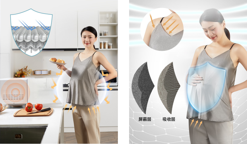 雙層防護:外層銀離子面料能有效屏蔽電磁波,內(nèi)層吸收輻射面料將逸散進來的電磁輻射吸收轉化為安全的能量;