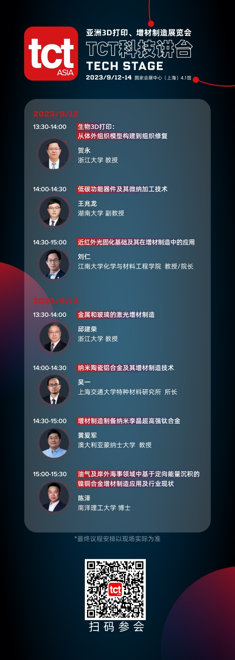 為了進(jìn)一步為增材制造技術(shù)發(fā)展注入“源頭活水”,推動(dòng)創(chuàng)新成果轉(zhuǎn)化與市場化的對(duì)接,TCT科技講臺(tái)邀請(qǐng)了國內(nèi)外眾多知名高等院校、研究院的專家學(xué)者、研究員等擔(dān)任演講者,其中包括浙江大學(xué)、上海交通大學(xué)、湖南大學(xué)、江南大學(xué)、新加坡南洋理工大學(xué)、澳大利亞蒙納士大學(xué)等。