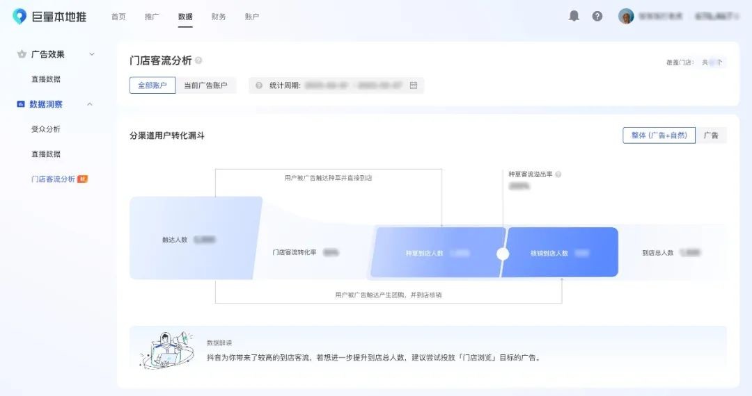相應(yīng)地,APP端的頁面以漏斗形式呈現(xiàn),從上到下呈現(xiàn)觸達(dá)人數(shù)和整體門店客流,商家還可以通過切換【整體廣告+自然】和【廣告】,查看廣告對應(yīng)成本。