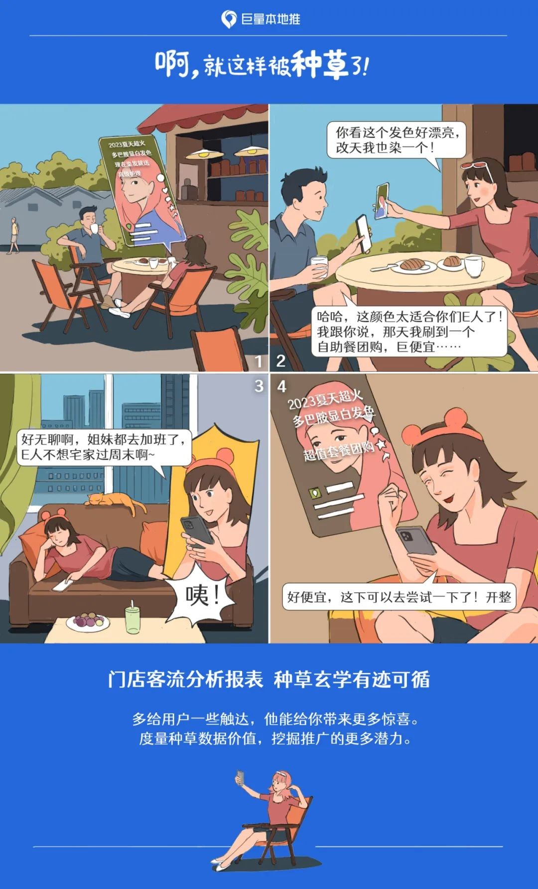 比如漫畫中的女生被一條短視頻“種草”了美發(fā)店,但因?yàn)楦笥蚜奶燹D(zhuǎn)移了注意力,沒有當(dāng)時(shí)團(tuán)購下單,卻又在一個無所事事的周末,再次刷到這家美發(fā)店,這次女生果斷下單團(tuán)購到店消費(fèi)。這樣一來,這位女生就被計(jì)入了「門店客流分析」報(bào)表中,我們可以以此為依據(jù),進(jìn)一步去轉(zhuǎn)化像漫畫中的女生這樣的消費(fèi)者,或者擴(kuò)大我們的“種草人群”。