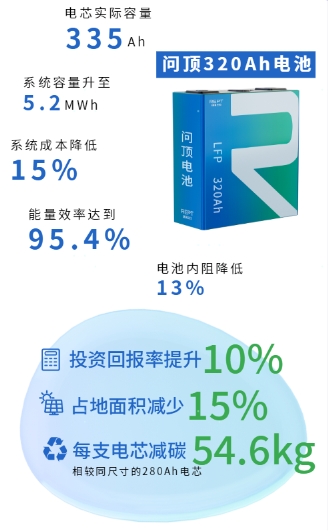 問頂320Ah電池以其超行業(yè)標(biāo)準(zhǔn)的強性能備受矚目,規(guī)?;瘧?yīng)用問頂320Ah電芯能能夠減少15%的用地面積,增加10%以上的凈利潤,且相較同尺寸的280Ah電芯,每支320Ah電芯減碳54.6kg,減碳減排,助力碳中和目標(biāo)。