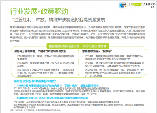 2022年3月,國(guó)家藥監(jiān)局公布自2024年4月起射頻類(lèi)家用美容儀將正式納入醫(yī)療器械管理,入局門(mén)檻提高企業(yè)需“持證上崗”。行業(yè)監(jiān)管新規(guī)將加速未來(lái)行業(yè)內(nèi)小品牌出清、品牌向頭部集中。自2010年前以海外品牌為代表的家用美容儀品牌打入中國(guó)市場(chǎng)開(kāi)始,國(guó)際品牌長(zhǎng)期占領(lǐng)國(guó)內(nèi)市場(chǎng)。2015年后,國(guó)產(chǎn)品牌逐步入局見(jiàn)諸市場(chǎng),隨著國(guó)產(chǎn)品牌的持續(xù)發(fā)力和深耕,其中以AMIRO覓光為代表的國(guó)產(chǎn)品牌逐漸躋身頭部市場(chǎng)。在國(guó)家監(jiān)管政策釋放的紅利下,科研技術(shù)成為推動(dòng)精準(zhǔn)護(hù)膚行業(yè)發(fā)展的關(guān)鍵底層支持。