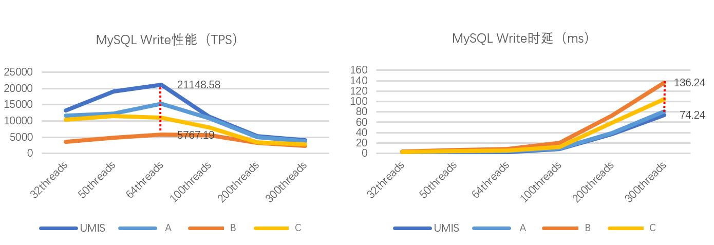 如圖4 所示,MySQL 寫場景下,憶聯(lián) UH8 系 SSD始終保持著明顯優(yōu)勢,性能表現(xiàn)強(qiáng)勁。對比友商,在吞吐量上至高可提升 266% ;在時(shí)延上至高可降低 83% 左右。意味著,在使用憶聯(lián) UH8 系 SSD 作為MySQL數(shù)據(jù)庫存儲介質(zhì)時(shí),可提高整個(gè)數(shù)據(jù)庫系統(tǒng)的存儲速度。