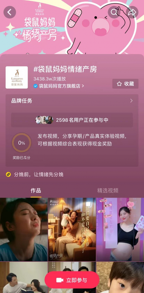 回歸品牌產品,袋鼠媽媽發(fā)起了主題為袋鼠媽媽「情緒產房」的全民挑戰(zhàn)賽,定向邀請用戶參與“淡定當媽沒紋題”為主題的內容創(chuàng)作中來,話題發(fā)出當天已吸引了兩千多名抖音用戶參與,話題播放量達兩千萬。