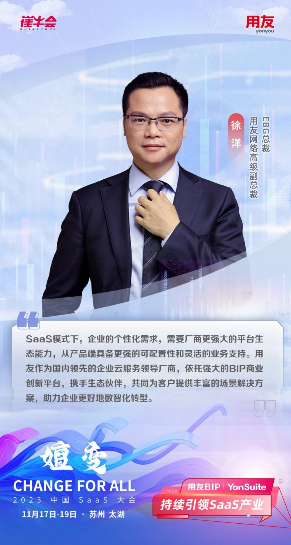 大會吸引了中國SaaS行業(yè)的頂尖企業(yè)和重量級領(lǐng) 袖,圍繞產(chǎn)業(yè)的未來發(fā)展和技術(shù)變革等關(guān)鍵話題進(jìn)行了深入的交流和探討。作為中國SaaS產(chǎn)業(yè)的領(lǐng) 軍者,用友受到主辦方的盛大邀請,用友網(wǎng)絡(luò)董事長兼CEO王文京、用友網(wǎng)絡(luò)高級副總裁 EBG總裁徐洋、用友網(wǎng)絡(luò)副總裁 集團(tuán)客戶成功部總經(jīng)理 畢思建、用友網(wǎng)絡(luò)助理總裁 YonSuite營銷中心總經(jīng)理 張磊出席了此次盛會,為現(xiàn)場嘉賓帶來寶貴的行業(yè)經(jīng)驗,同時也展示了用友在業(yè)界絕對的領(lǐng)軍地位和持續(xù)創(chuàng)新的能力。