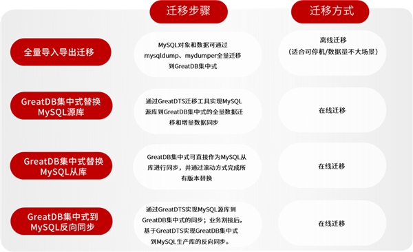 針對(duì)全量導(dǎo)入導(dǎo)出、MySQL源庫(kù)、MySQL從庫(kù)、MySQL反向同步4類客戶常見的應(yīng)用場(chǎng)景,萬(wàn)里數(shù)據(jù)庫(kù)給出了4類不同的遷移步驟以及相匹配的遷移方式。