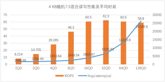 如圖4所示,在4KB隨機7:3混合讀寫性能場景中,UH711a在32QD及以下更具優(yōu)勢,IOPS峰值在32QD時可達62.3K,對應平均時延為6535.83 us(6.5ms[ 1ms=1000 us。])。當隊列深度大于32QD時,IOPS呈下降趨勢,平均時延顯著增加。