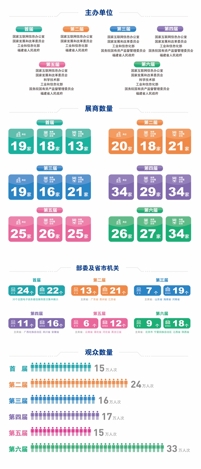 數(shù)字中國建設(shè)成果展覽會(huì)舉辦六年以來,全國34個(gè)省 (自治區(qū)、直轄市)和港澳臺(tái)地區(qū)的政 府、機(jī)構(gòu)或企業(yè)代表均積極參展。國家部委機(jī)關(guān)累計(jì)參展達(dá)70次。央企、世界500強(qiáng)、中國500強(qiáng)等實(shí)力企業(yè)積極參展,展覽規(guī)模逐年遞增。