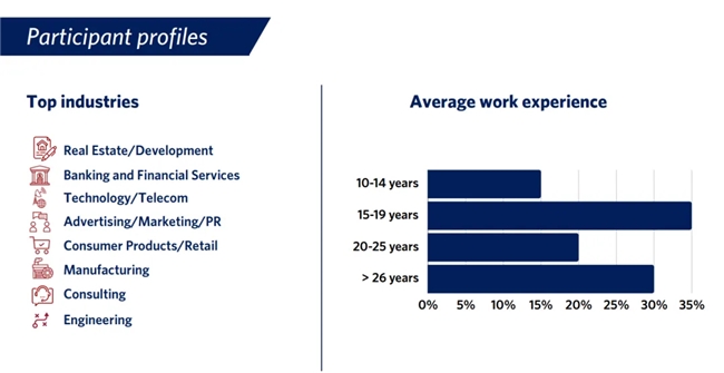 課程自上線以來,已收到來自美國、英國、阿根廷、新加坡等多個國家學員的入學申請。這些學員來自各行各業(yè),包括房地產、金融服務、技術、電信、廣告、市場營銷、消費品、零售、制造、咨詢和工程等關鍵領域,并且大多都擁有15-19年工作經驗。