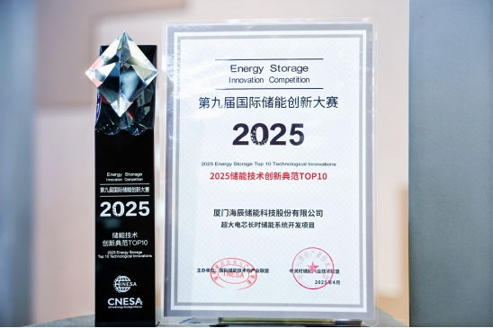4月10日,第13屆儲能國際峰會暨展覽會(ESIE2025)在北京隆重開幕,同期舉辦第九屆國際儲能創(chuàng)新大賽頒獎典禮,海辰儲能基于超大電芯長時儲能系統(tǒng)開發(fā)項目和儲能預制艙及儲能系統(tǒng),分別摘獲“2025儲能技術(shù)創(chuàng)新典范TOP10”和“2025儲能專利創(chuàng)新典范TOP5”兩項大獎。