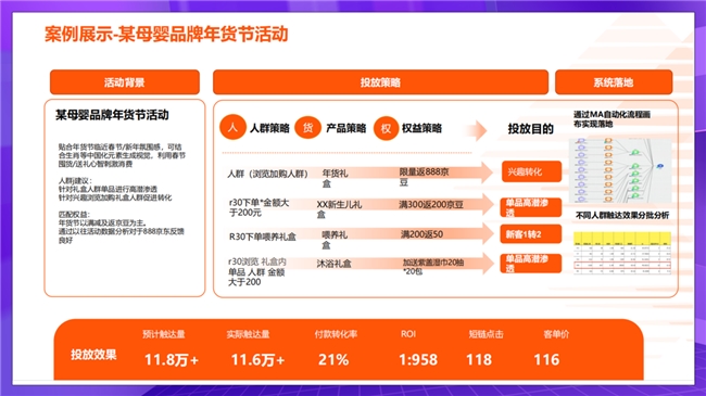 ? 公域代投:運(yùn)用京小智?數(shù)坊公域標(biāo)簽、羚羊數(shù)據(jù)、數(shù)據(jù)銀行投放及行業(yè)競(jìng)品人群觸達(dá)能力,精準(zhǔn)圈選潛在客群。如某 3C 品牌在618預(yù)售中通過(guò)數(shù)據(jù)銀行人群包匹配 + 公域短信投放,新客占比提升 30%。