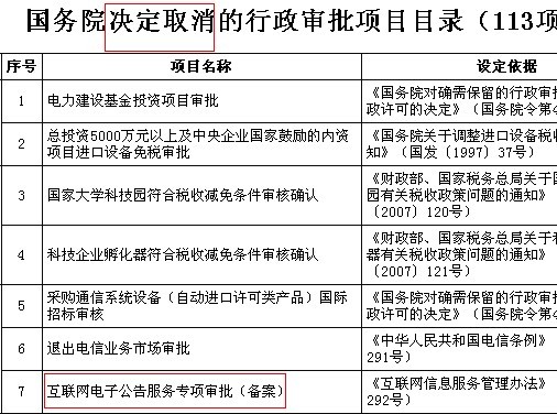 7月10日消息,中國政府門戶網(wǎng)站正式發(fā)布關(guān)于國務(wù)院取消和下放管理層行政審批項(xiàng)目的決定。其中,互聯(lián)網(wǎng)電子公告服務(wù)專項(xiàng)審批(備案)被列入國務(wù)院決定取消的行政審批項(xiàng)目目錄。