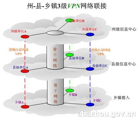 阿壩州電子政務外網采用“王”字型廣域網絡結構,電子政務外網采用核心層、匯聚層、接入層典型的三層結構,各個接入單位的局域網構成用戶層。核心層使用ATM鏈路,完成各個節(jié)點之間的數(shù)據交換,匯聚層完成各接入用戶的數(shù)據匯總,通過一條線路送到骨干層。我州電子政務外網采用VPN技術。通過VPN服務,為各個接入單位實現(xiàn)透明的“縱網”聯(lián)接;并通過VPN 技術建設“橫網”。各個“縱網”之間實現(xiàn)了IP地址的重疊,原則上“縱網”保留其系統(tǒng)內部規(guī)劃的IP使用方案。