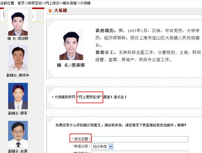 大場鎮(zhèn)政府網(wǎng)站“網(wǎng)上咨詢”網(wǎng)址:http://www.dachang.gov.cn/consultation/