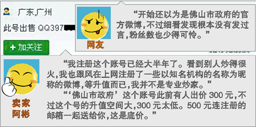"佛山市政府’這個賬號此前有人出價300元,不過這個號的升值空間大,300元太低。500元,我連注冊的郵箱一起送給你。”阿彬向記者亮出了底價。不過,作為一個從沒賣出過賬號的業(yè)余炒家,他甚至不明白怎樣進行交易,“我要想想怎么賣給你。”