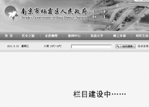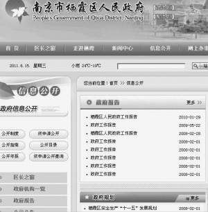 根據(jù)張先生的指引,記者打開了南京市棲霞區(qū)人民政府的網(wǎng)站,網(wǎng)站首頁上設計了“區(qū)長之窗”“走進棲霞”“新聞中心”“信息公開”“網(wǎng)上辦事”“政民互動”“投資棲霞”“便民服務”等子板塊。