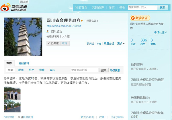 經(jīng)過認證的名為“四川省會理縣政府”的微博于18點24分發(fā)布第一條微博,稱“由于我縣工作人員的失誤,在政府網(wǎng)站上發(fā)表了一張PS過的照片,他對于新聞?wù)鎸嵭缘睦斫庥姓`,使得我縣在網(wǎng)絡(luò)上受到了更多的關(guān)注。在此,會理縣政府對于廣大網(wǎng)友的關(guān)注表示理解,并希望對此事道歉,并澄清。”