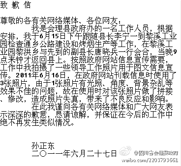 隨后,微博發(fā)布了署名“孫正東”的會理縣政府工作人員的道歉聲明,稱由于“照片光照、角度、背景雜亂等問題,在使用時對該張照片做了拼接、修改,造成照片失真”,并向媒體和網(wǎng)友道歉。