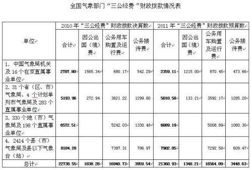 2011年全國(guó)氣象部門“三公經(jīng)費(fèi)”財(cái)政撥款預(yù)算數(shù)為21360.93萬(wàn)元,比2010年實(shí)際支出數(shù)減少1377.62萬(wàn)元,壓縮6.06%。其中,因公出國(guó)(境)費(fèi)1348.21萬(wàn)元,比2010年減少490.07萬(wàn)元;公務(wù)用車購(gòu)置及運(yùn)行費(fèi)16564.09萬(wàn)元,比2010年減少376.64萬(wàn)元;公務(wù)接待費(fèi)3448.63萬(wàn)元,比2010年減少510.91萬(wàn)元。