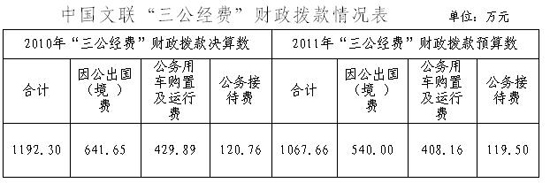 中國(guó)文學(xué)藝術(shù)界聯(lián)合會(huì)(包括中國(guó)文聯(lián)機(jī)關(guān)及各全國(guó)文藝家協(xié)會(huì)等13家所屬單位)2011年“三公經(jīng)費(fèi)”財(cái)政撥款預(yù)算1067.66萬元,其中:因公出國(guó)(境)費(fèi)540.00萬元,主要用于出訪國(guó)(境)外進(jìn)行文化交流、文化合作、組織展覽、展映、演出等對(duì)外文化宣傳交流活動(dòng)支出;公務(wù)用車購(gòu)置及運(yùn)行費(fèi)408.16萬元,主要用于公務(wù)用車購(gòu)置、保險(xiǎn)、維修保養(yǎng)、汽油等支出;公務(wù)接待費(fèi)119.50萬元,主要用于國(guó)內(nèi)外接待活動(dòng)中發(fā)生的必要支出。