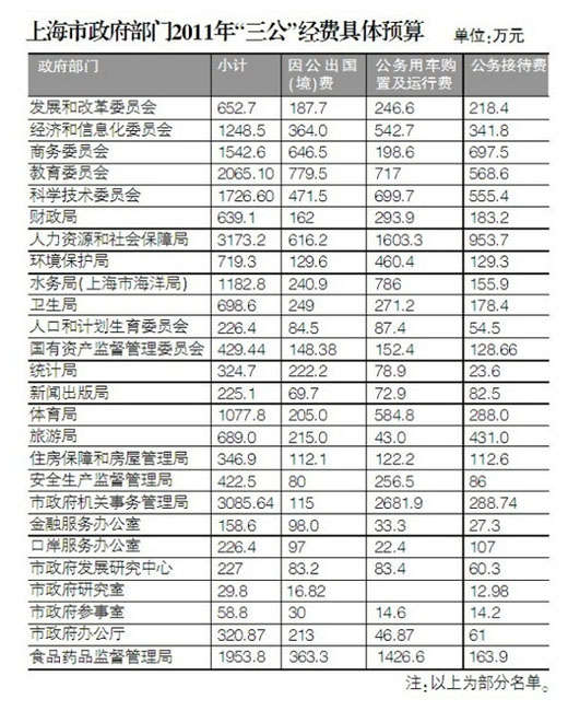 東方網(wǎng)9月5日消息,據(jù)《東方早報(bào)》報(bào)道,上海市各政府部門(mén)正陸續(xù)公開(kāi)2011年“三公”經(jīng)費(fèi)預(yù)算說(shuō)明。市政府各部門(mén)公開(kāi)的形式基本上都是統(tǒng)一的,即包括預(yù)算的說(shuō)明與情況表,預(yù)算說(shuō)明分別對(duì)“三公”的3項(xiàng)內(nèi)容做了說(shuō)明。