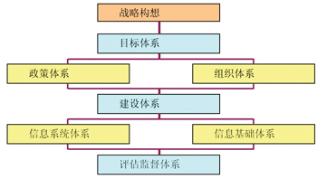 目前,許多發(fā)達(dá)國(guó)家在推進(jìn)政府信息化建設(shè)過(guò)程中,注重按照戰(zhàn)略管理的思想,采用戰(zhàn)略管理的方法和途徑,構(gòu)建政府信息化建設(shè)管理體制。其戰(zhàn)略管理體系框架就是在戰(zhàn)略構(gòu)想的指導(dǎo)下,建立目標(biāo)體系、政策體系、組織體系、建設(shè)體系、信息系統(tǒng)體系、信息基礎(chǔ)體系、評(píng)估監(jiān)督體系等七類(lèi)體系(如圖1所示),以保持政府信息化建設(shè)的創(chuàng)新發(fā)展、均衡發(fā)展和可持續(xù)發(fā)展。