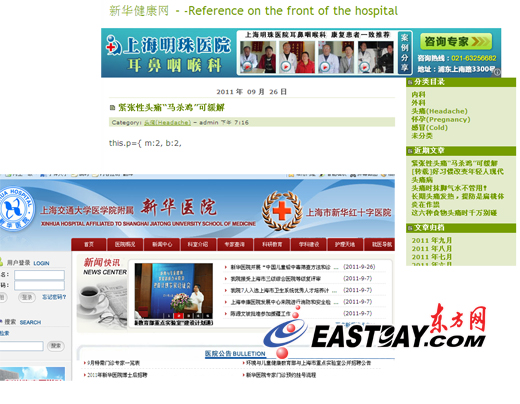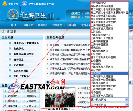 圖片說明:上海市衛(wèi)生局網(wǎng)站提供的新華醫(yī)院網(wǎng)站鏈接竟然是一家名為“新華健康網(wǎng)”。下方網(wǎng)站截屏為該院指定官網(wǎng)。