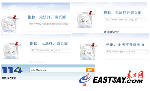 按照唐女士的方式,東方網(wǎng)記者10月8日上午,通過上海市衛(wèi)生局官方網(wǎng)站點擊進入的上海市精神衛(wèi)生中心、復(fù)旦大學附屬華山醫(yī)院、復(fù)旦大學附屬華東醫(yī)院、金山醫(yī)院、上海第一婦嬰保健院等5家醫(yī)院的網(wǎng)站均顯示“無法打開”。此外,上海市衛(wèi)生局網(wǎng)站提供的新華醫(yī)院網(wǎng)站鏈接竟然是一家名為“新華健康網(wǎng)”(http://www.xinhua-scmc.com.cn/)的網(wǎng)站,記者向該院求證,被告知該院唯一官方網(wǎng)站為“http://www.xinhuamed.com.cn”。