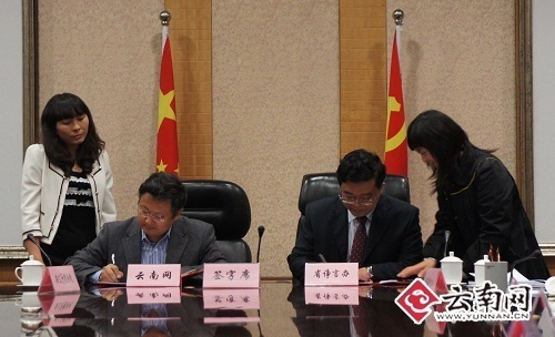 云南省政府研究室副主任孔燦和云南日報報業(yè)集團副總編、云南網(wǎng)總編柴紅飚簽訂云南省諍言辦與云南網(wǎng)共建云南諍言網(wǎng)協(xié)議。