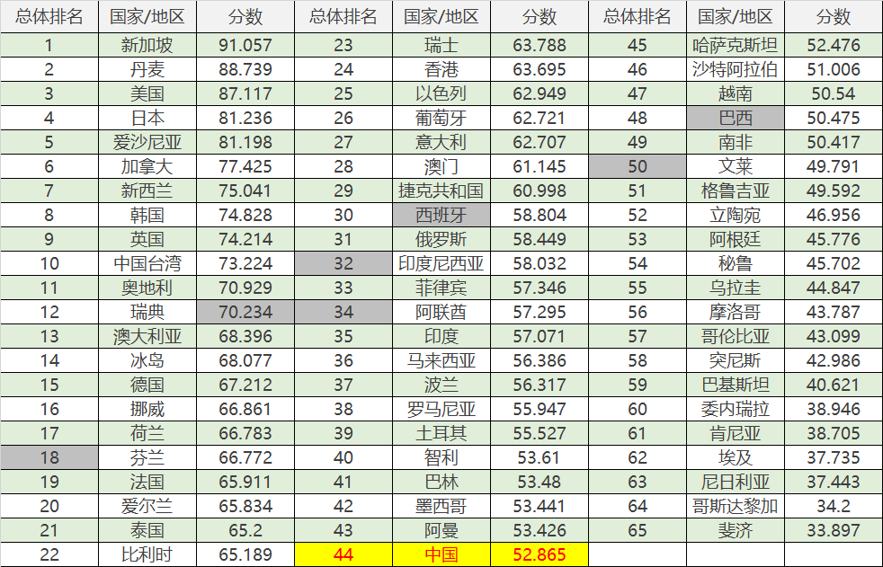 2017年排名位于中間位置的國家中,泰國、比利時、瑞士、西班牙和俄羅斯等國家的排名有所上升,與去年相比,排名沒有太大變化。只有少數(shù)國家在排名上有較大的變化,如與去年相比阿聯(lián)酋上升了六名,中國上升了四名,智利下降了六名,格魯吉亞上升了六名。