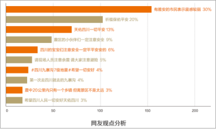 經(jīng)分析,在該條微博下,40%的網(wǎng)友留言為四川災(zāi)區(qū)祈福,希望“天佑四川一切平安”;30%的網(wǎng)友留言稱(chēng)“有雅安的市民表示震感較弱”;15%的網(wǎng)友提醒“四川的小伙伴一定注意安全”;5%的網(wǎng)友希望現(xiàn)場(chǎng)人員可以注意余震;4%的網(wǎng)友表示自己去過(guò)九寨溝;3%的網(wǎng)友表示震中離景區(qū)很近。“平安”一詞成為這一單條微博評(píng)論中被提及最高的詞匯,達(dá)37.3萬(wàn)次;其次則是“四川”和“保佑”“天佑”。