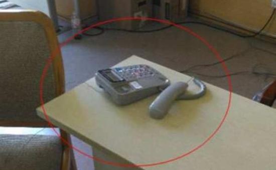 其中一部電話的聽筒被拿起放在一旁。