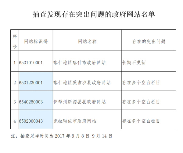 三季度網(wǎng)站抽查工作中,大部分單位的網(wǎng)站內(nèi)容維護(hù)及時(shí),運(yùn)行正常,但仍然存在一些問題,一是少數(shù)地方工作落實(shí)不到位,個(gè)別政府網(wǎng)站問題仍較突出。喀什地區(qū)喀什市政府網(wǎng)站、英吉沙縣政府網(wǎng)站、伊犁州新源縣政府網(wǎng)站、克拉瑪依市政府網(wǎng)站存在欄目更新不及時(shí)、空白欄目數(shù)超過5個(gè)等問題。