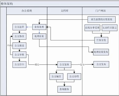 工作人員在辦公系統(tǒng)(OA)中進(jìn)行日常工作,起草公文或?qū)徟?,通過(guò)審批的公文進(jìn)行歸檔處理,需要發(fā)布的公文進(jìn)入門戶網(wǎng)站進(jìn)行發(fā)布;其他的辦公文檔也可依此程序進(jìn)行歸檔和發(fā)布,打通產(chǎn)生、存檔、發(fā)布之間人為的系統(tǒng)獨(dú)立所造成的障礙,從而實(shí)現(xiàn)真正意義上的政務(wù)公開,也使得辦公系統(tǒng)中產(chǎn)生的文檔都能被統(tǒng)一保存。