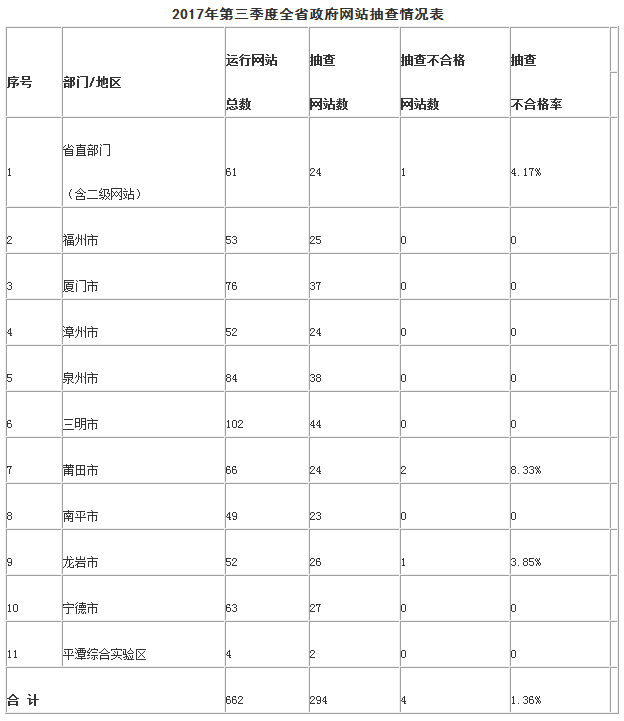 根據(jù)《國務院辦公廳關于印發(fā)政府網(wǎng)站發(fā)展指引的通知》(國辦發(fā)〔2017〕47號)和《福建省人民政府辦公廳關于做好全省政府網(wǎng)站普查抽查的通知》(閩政辦函〔2016〕59號)要求,省政府辦公廳組織開展了2017年第三季度全省政府網(wǎng)站抽查。現(xiàn)將情況通報如下: