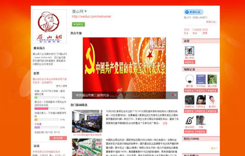 2011年3月1日,眉山市政府新聞辦分別注冊了“微眉山”、“微博東坡給力眉山”。截至2012年1月,全市官方微博數(shù)量已達22個,黨政機關(guān)個人微博62個,其中,“眉山交警”和“眉山工商”關(guān)注度達2萬余人,“微眉山”的關(guān)注度更是高達15萬余人,“粉絲”數(shù)量均居全省前列。