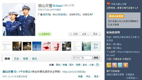 龍年春節(jié)期間,四川眉山市“微眉山”、“眉山交警”、“眉山氣象”等政務(wù)微博分別發(fā)布了數(shù)十條春運服務(wù)信息,既滿足了群眾出行的需要,又充分體現(xiàn)了人性化關(guān)懷,備受群眾歡迎。