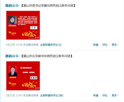 圖為眉山市委書記和市長通過政務(wù)微博向網(wǎng)民朋友拜年的微博截圖